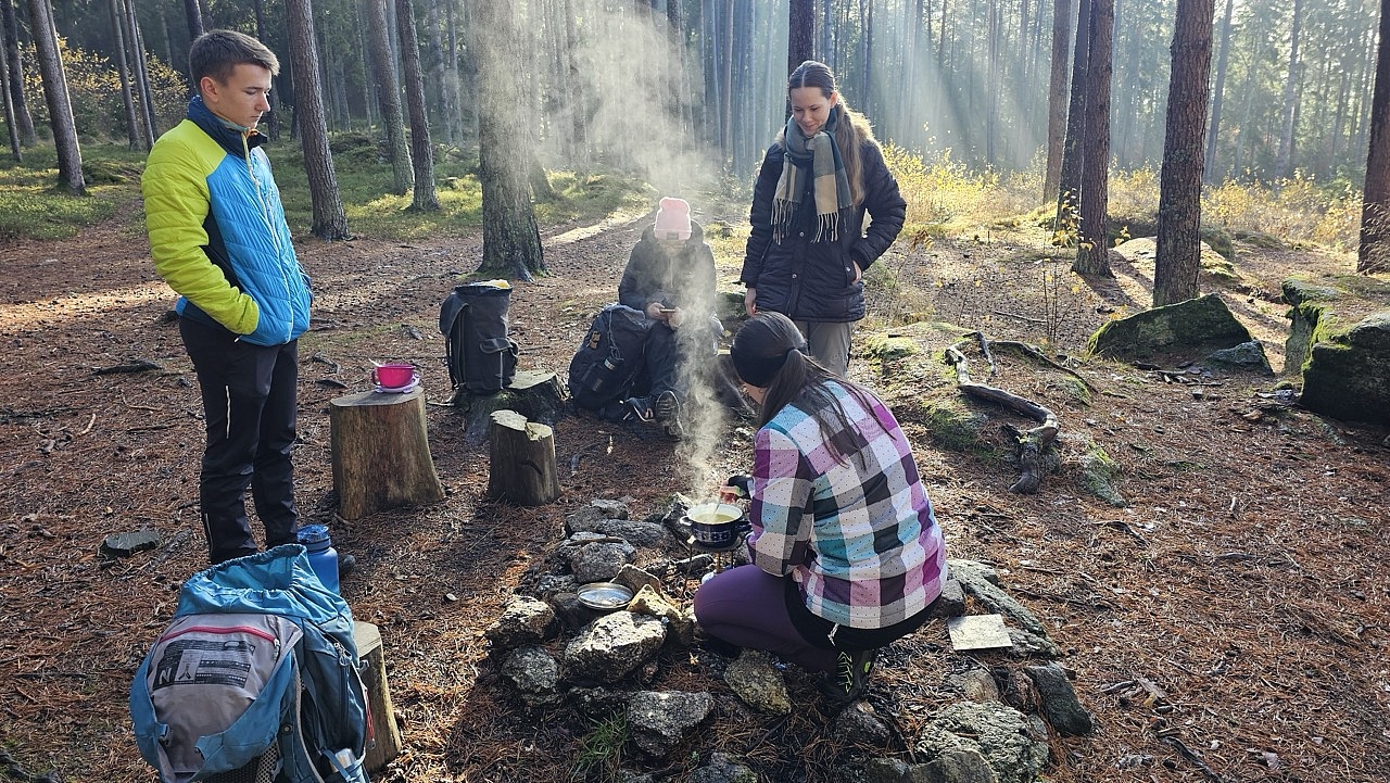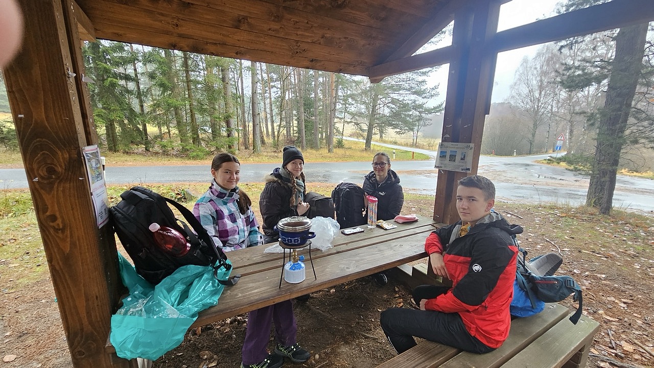Ostrá expedice proběhla ve dnech 16.–17. listopadu za typicky pozdně podzimních podmínek – vystřídalo se nám postupně: střídavě sucho, chladno, vítr a vytrvalý déšť. Přesto (a možná právě proto) šlo o velmi poctivou zkoušku vytrvalosti i týmové spolupráce. Trasa vedla z Českého Rudolce po Graselově stezce směrem na Stálkov, dále do okolí Landštejna a zpět přes lesní úseky České Kanady. Na vybraných úsecích jsme se systematicky zastavovali u zajímavých žulových útvarů, jako u dalších zajímavosti v místní krajině (např. rybník Pstruhovec a vodní nádrž Landštejn). Účastníci expedice dále přenocovali ve skautské ubytovně ve Stálkově. Jiří „Bob“ Kněžíček, správce objektu, skaut a „Vandrák z České Kanady“, nám demonstroval v místním indiánském hoganu rozdělávání ohně metodou tření lipových dřev. Tato zkušenost byla pro žáky jistě přínosná i pro budoucí pohyb terénu a krásně vyplnil večerní program. Večer se v chatě zastavil i hodnotitel bronzové expedice, pan učitel Lovětínský. Při hraní deskových her jsme společně shrnuli zážitky z úvodního dne expedice. Druhý den jsme se již za vydatného deště vraceli do Českého Rudolce, startu i cíle celé expedice. Niky a Denča absolvováním této expedice splnily poslední část bronzové úrovně a v únoru se zúčastní ceremonie DofE 2026 v Husitskému muzeu v Táboře.