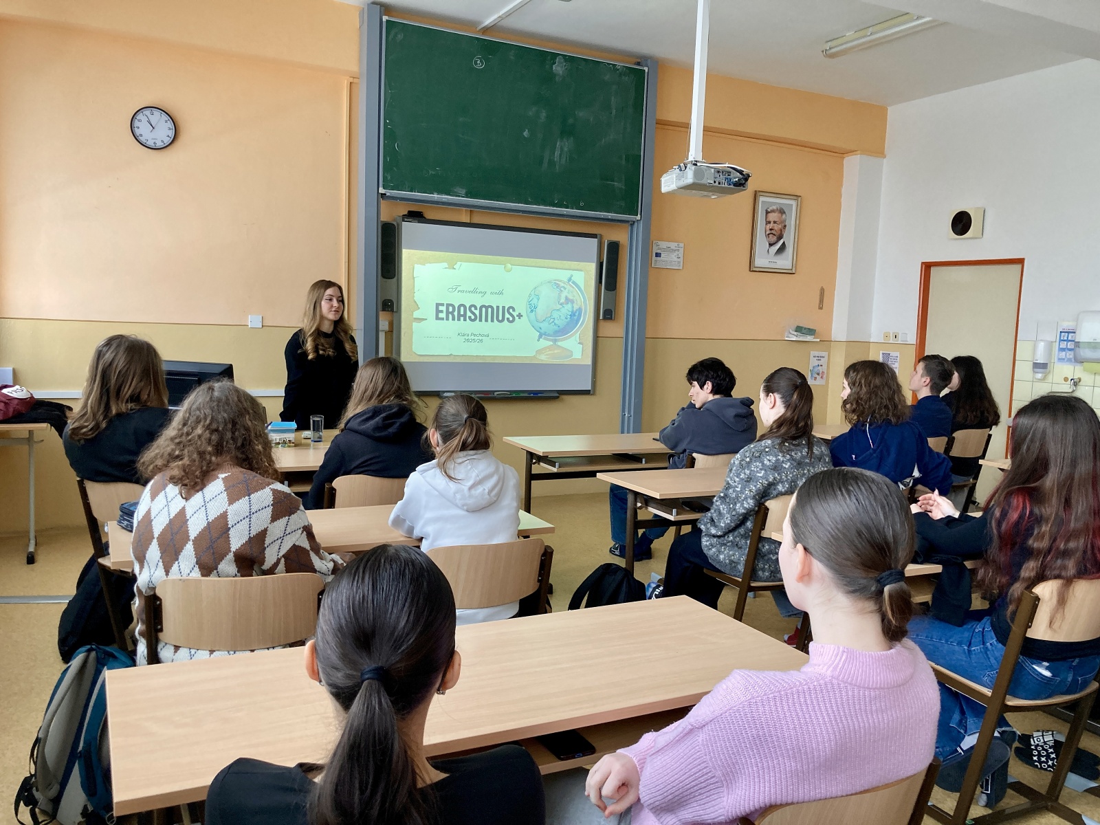 Na úvod se žáků zeptala, do jaké země by se chtěli podívat. Padala různá jména, například Švédsko, Portugalsko či Španělsko, ale také Thajsko, Japonsko nebo Nový Zéland. Poté Klára seznámila studenty s tím, že v rámci Erasmu+ mohou cestovat mladí lidé od 13 do 30 let, a to do zemí uvnitř i mimo Evropskou unii. Výměny mládeže, kterých se mohou zúčastnit, zpravidla trvají pět až jedenadvacet dní a z programu Erasmus budou mít uhrazeny veškeré cestovní náklady, ubytování, stravu i cestovní pojištění. Studenti zaplatí pouze příspěvek organizátorům ve výši 1.000 Kč.